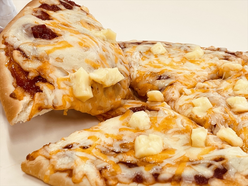 The Pizza contains large volumes of 4 different kinds of cheeses. Mozzarella cheese, Edam cheese, Cheddar cheese, and Blue cheese.